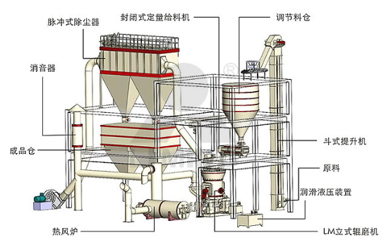 集破碎、干燥、粉磨、分级输送于一体,系统简单,布局紧凑,占地面积约为球磨系统的50%,可露天布置,因此能大量降低投资费用。
