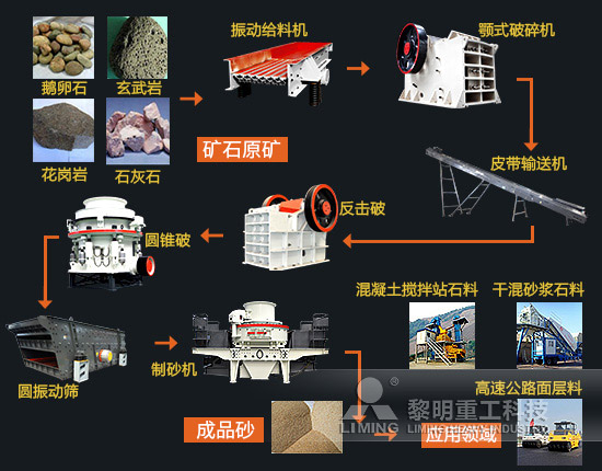 由黎明重工配置的砂石骨料生产线,其基本工艺流程为:矿石原矿,例如石灰石、河卵石、玄武岩、方解石、花岗岩等通过自卸车将小于500mm的石料送入振动给料机,振动给料机把石料均匀的送入颚式破碎机进行粗破,然后大小在150mm-300mm左右的石料将被送入反击式破碎机或者圆锥式破碎机进行二级破碎,破碎后的物料则通过圆振动筛进行筛分,大于成品的物料将返回反击破重新进行破碎,达标的物料将会被送入制砂机制成细度合适的成品,后,再由圆振动筛对成品进行分级筛分,经皮带输送机输送至成品区。