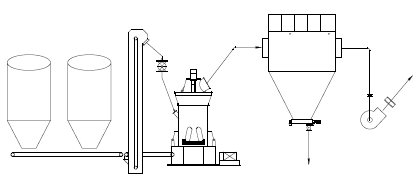 在生产立窑产品时,回转窑仓底闸板阀关闭,立窑仓底闸板打开,生石灰通过定量皮带输送机、提升机、锁风喂料机进入立磨内,粉磨后的成品经分级后进入袋式收尘器收集后经刮板输送机进入石灰粉成品仓,外排料通过外循环系统重新入磨粉机。