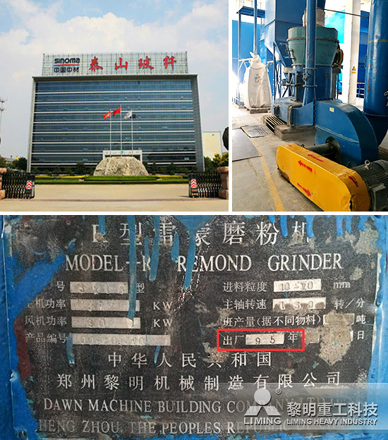 今年的走访活动中,更令人称道的是:中国中材泰山玻璃纤维有限公司,一台由黎明重工于1995年生产,迄今投产21年之久的磨粉机仍在为客户效力,并保持正常运行。进入整洁规范的客户生产现场,这台蓝色的雷蒙磨粉机正在有条不紊地作业进行中。与目前以灰白为主色调的新一代磨机外壳体大气的外观不同,雷蒙磨的蓝色机身显得清新活力。但是机身上面斑驳的铭牌依然告诉我们,这已经是一员“老将”了。铭牌虽然斑驳,但上面各项功率、型号及生产日期还清晰可见。通过上面的文字,我们了解到这台R型雷蒙磨粉机生产于1995年,型号是雷蒙磨粉机3216型。在与客户聊天中,走访人员了解到这台磨机加工的物料是叶腊石,尽管已经使用二十余年,仍然正常运行没有出现重大问题。