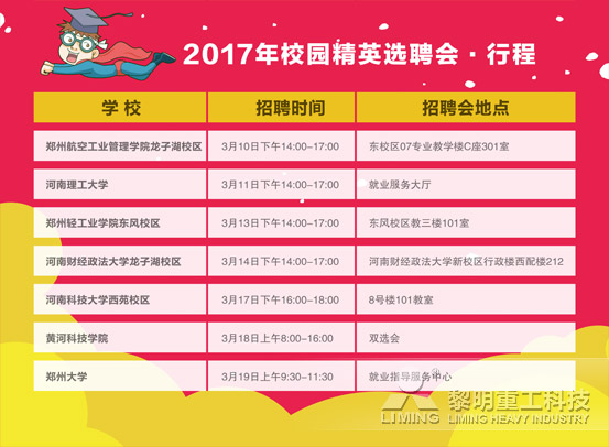 2017年,集团郑州公司人才引进统一部署,寻找共同的事业伙伴加入我们。在接下来的一段时间内,黎明重工HR团队将相继走进郑州航空工业管理学院、河南理工大学、郑州轻工业学院、河南财经政法大学、河南科技大学、黄河科技学院以及郑州大学等知名学府展开2017春季校园招聘宣讲会,届时您将可以近距离与我们的HR交流更多详细信息。
