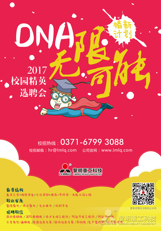 欢迎技术支持类、电子商务类、外贸营销类、市场营销类、生产管理等专业人才加入黎明,您可以随时与黎明重工企业HR取得联系(0371-67993088),获取招聘专业、人数、岗位等相关信息。走出校门,2017年,希望黎明重工能与你共同见证无限可能!