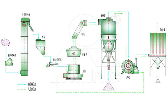 储存在原料库中的物料,经破碎机破碎后通过提升机提至调节料仓,再经电磁振动给料机送入欧版磨主机内进行粉磨,在此环节除铁器将含铁异物排除,确保主机内部。物料在磨粉机内部通过磨辊和磨环的相互碾压、研磨而被粉碎,粉碎后的物料在风力的作用下吹向选粉机进行分选,分选后的合格物料经管道进入旋风集粉器收集,经卸料阀输出即为成品,未达到细度要求的物料重新回到主机再次研磨,粉磨后的成品通过提升机提至成品料罐储存。