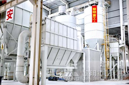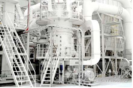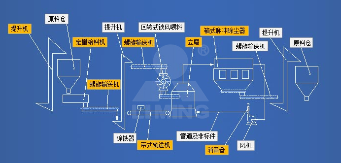 经破碎和严格除铁后的原料,经斗式提升机进入原料仓堆放。在事先设定给料量的情况下,定量给料机称量物料并把物料经提升和输送设备喂入LUM超细立式磨机内进行粉磨,在此过程中定量给料机的电脑记录累积给料量,并显示在屏幕上。回转式锁风喂料机可使超细立磨在得到喂料的同时,又避免多余的空气进入磨内。合格成品粉的收集由一台箱式脉冲布袋除尘器完成,减少了设备台数,简化了系统配置。成品粉收集后用螺旋给料机通过其它输送设备送至成品料仓或直接包装。有少量没有得到粉磨的物料,经返料皮带机回到给料机中,重新进入超细立磨进行粉磨。在经过皮带机时,少量的铁会被除铁器吸住,保障了超细立磨的运行。